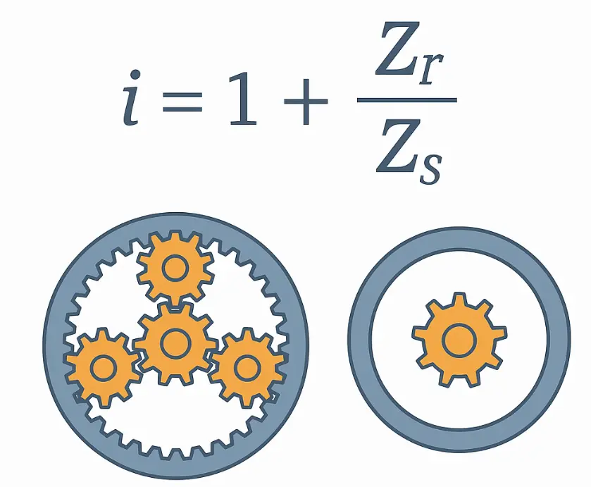 สูตรสำหรับการคำนวณอัตราส่วนการส่งสัญญาณของตัวลดดาวเคราะห์นั้นไม่ซับซ้อน โครงสร้างที่พบบ่อยที่สุดคือเกียร์ดวงอาทิตย์ทำงานวงแหวนด้านในได้รับการแก้ไขและผู้ให้บริการดาวเคราะห์จะถูกส่งออก ภายใต้โครงสร้างนี้สูตรสำหรับการคำนวณอัตราส่วนการส่งคือ: